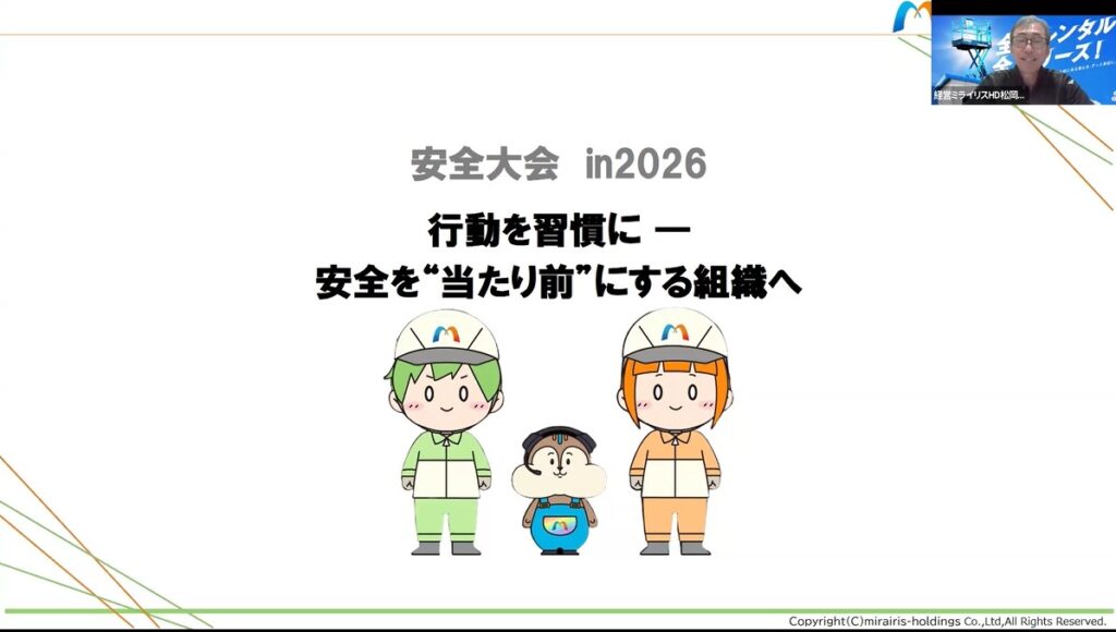 2026.02.19 お知らせ ~安全大会実施のお知らせ~ 当グループの親会社であるミライリスホールディングス株式会社主催のもと、グループ各社を対象とした安全大会を実施いたしました。 本大会では、安全意識の向上および労働災害の未然防止を目的として、日々の業務における安全行動の重要性や、事故防止に向けた取り組みについて共有を行いました。 今後もグループ一丸となり、安全で安心な職場環境づくりに継続して取り組んでまいります。